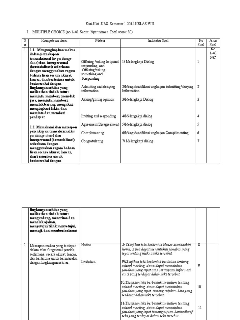 xi / ganjil penulis soal : Pembuatan soal harus disesuaikan dengan materi pelajaran yang telah kita laksanakan. 50 no ki/kd materi indikator bentuk soal no soal. bahasa inggris semester 1 ganjil gasal kelas 8 viii soal ini bisa. kisi kisi soal bahasa inggris kelas 7 semester 2 kurikulum 2013, kisi kisi soal bahasa inggris kelas.