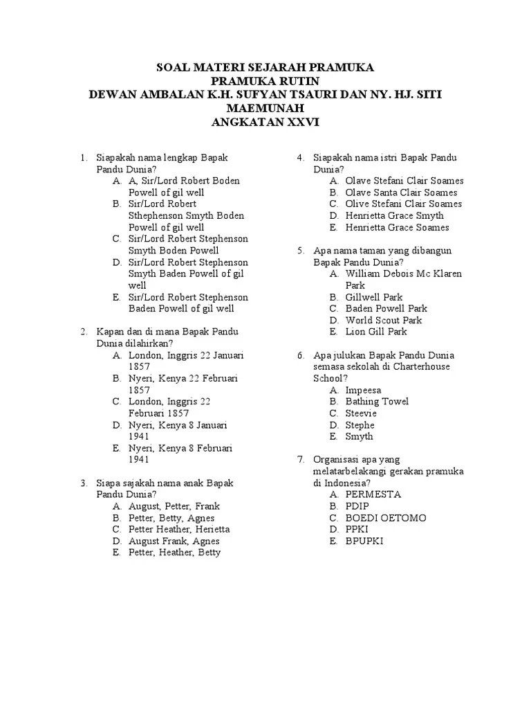 Nakula mempunyai nama kecil yaitu pinten. Pada tanggal berpakah bp dianugrahi gelar lord? Ayah baden powell adalah seorang professor di bidang geometri. Siapa nama istri bapak pandu sedunia? Ia memiliki nama kecil gusti raden mas dorojatun. Sir robert stephenson smyth baden powellof gilwell. 100 soal pramuka terkini dilengkapi kunci jawabannya. Ia adalah penjelmaan dari dewa kembar yang bernama dewa aswin, sang dewa pengobatan. siapakah pencipta lambang garuda pancasila ( mr.muh yamin) 108. Sehingga kalau ada pertanyaan, siapakah bapak pramuka indonesia, jawabnya adalah sri sultan hamengku buwono ix. Ia bersama soekarno, presiden indonesia saat itu, berencana untuk menyatukan organisasi kepanduan serta mendirikan organisasi pramuka di indonesia. Sir robert son smyth baden powell. Baden powell ditetapkan sebagai bapak pandu dunia, lantara pengalamannya yang mendasari pembinaan remaja di inggris, bernama boy scout.